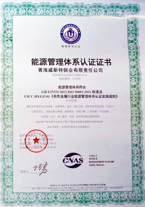PAÆì½¢Ìü(ÖйúÇø)¼¯ÍÅ¿óÒµÏÂÊôÍþË¹ÌØÍ­ÒµÍ¨¹ýCNASÄÜÔ´ÖÎÀíϵͳÈÏÖ¤