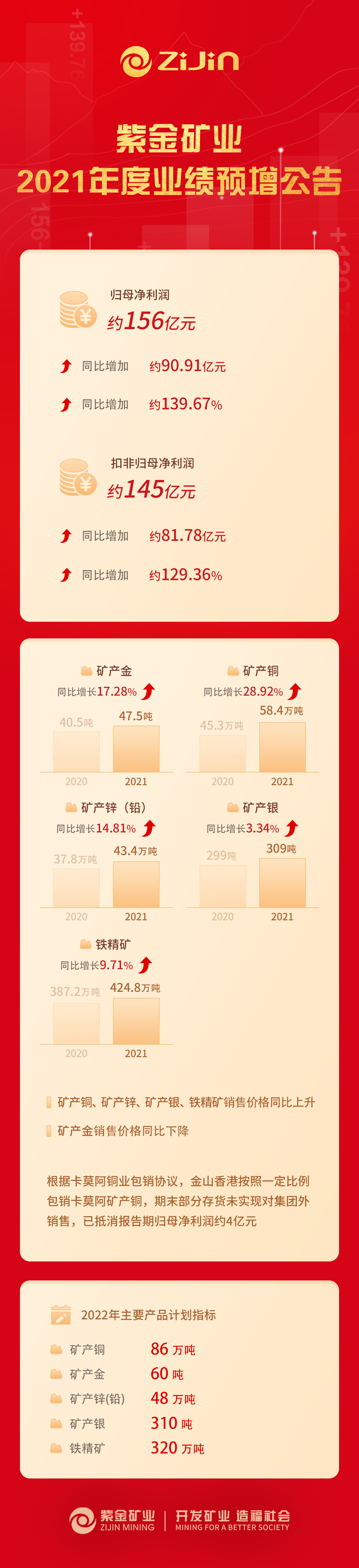 2021Ä꣬£¬£¬£¬£¬£¬¹«Ë¾ÊµÏÖÁËÉú²úÖ¸±ê¡¢Ä±»®Òµ¼¨¡¢ÖØ´óÏîÄ¿½¨ÉèÖÜÈ«³¬Ô¤ÆÚ¡£¡£¡£¡£¡£¡£ÕûÄêÖ÷Óª¿ó²úƷʵÏÖ²úÁ¿Îª£º¿ó²ú½ð47.5¶Ö£¬£¬£¬£¬£¬£¬Í¬±ÈÔöÌí17.28%£»£»£»£»£»£»¿ó²úÍ58.4Íò¶Ö£¬£¬£¬£¬£¬£¬Í¬±ÈÔöÌí28.92%£»£»£»£»£»£»¿ó²úп£¨Ç¦£©43.4Íò¶Ö£¬£¬£¬£¬£¬£¬Í¬±ÈÔöÌí14.81%£»£»£»£»£»£»¿ó²úÒø309¶Ö£¬£¬£¬£¬£¬£¬Í¬±ÈÔöÌí3.34%£»£»£»£»£»£»Ìú¾«¿ó424.8Íò¶Ö£¬£¬£¬£¬£¬£¬Í¬±ÈÔöÌí9.71%¡£¡£¡£¡£¡£¡£
